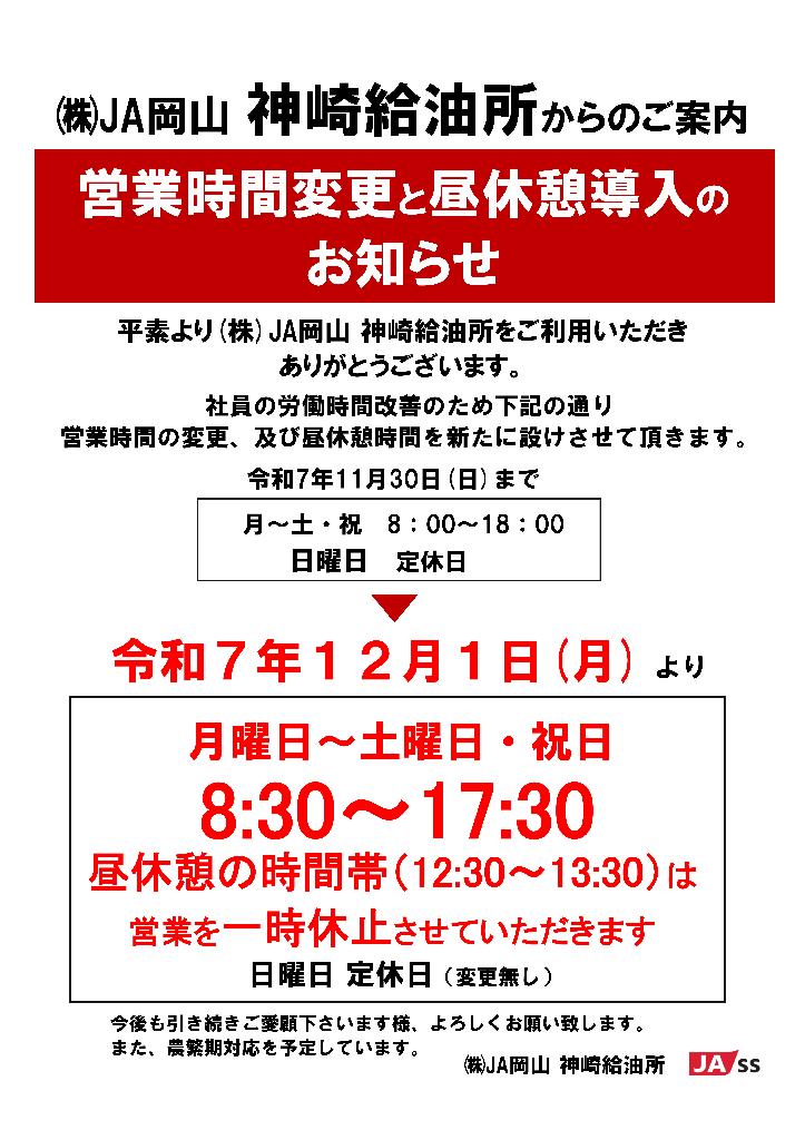 このたび、業務体制見直しに伴い下記の通り営業時間を変更させていただきます。